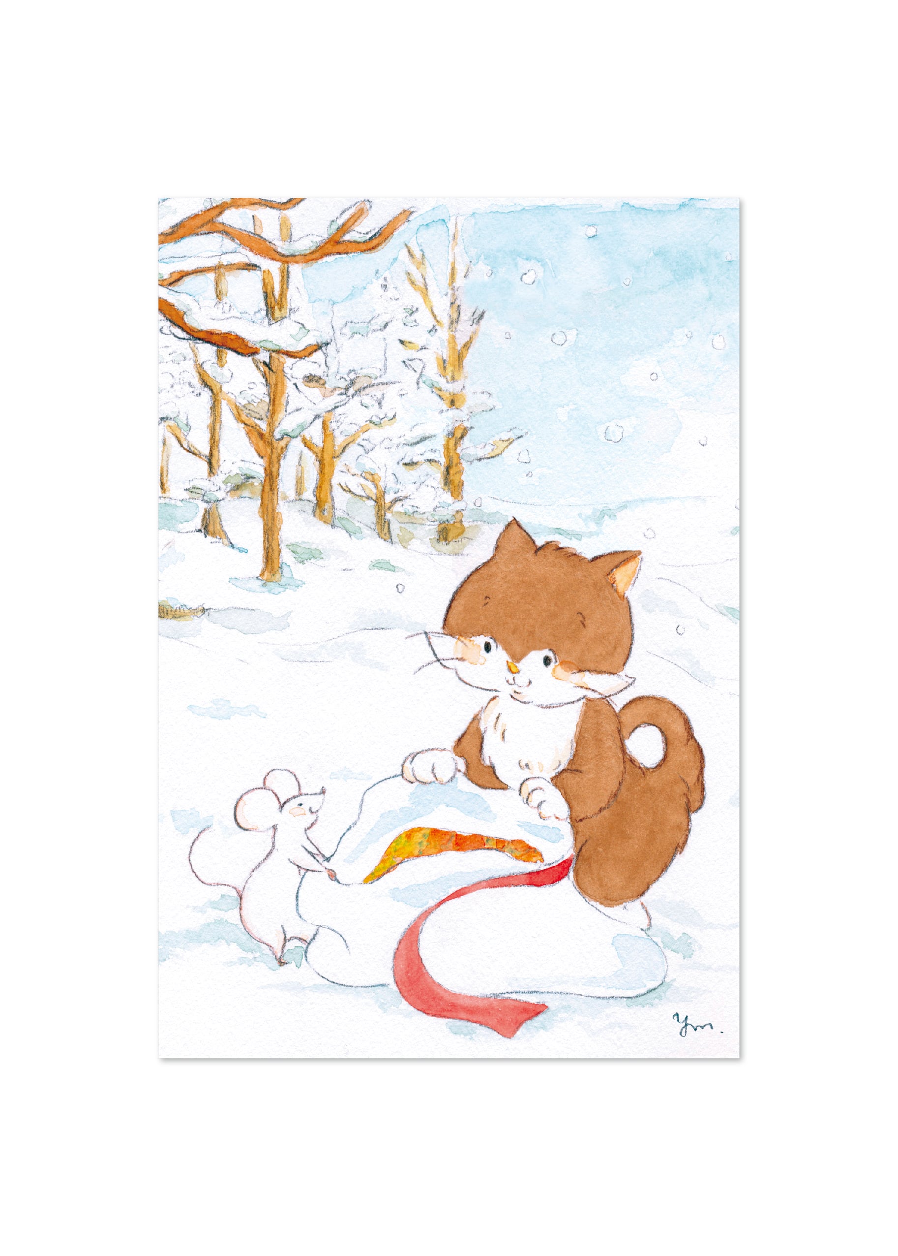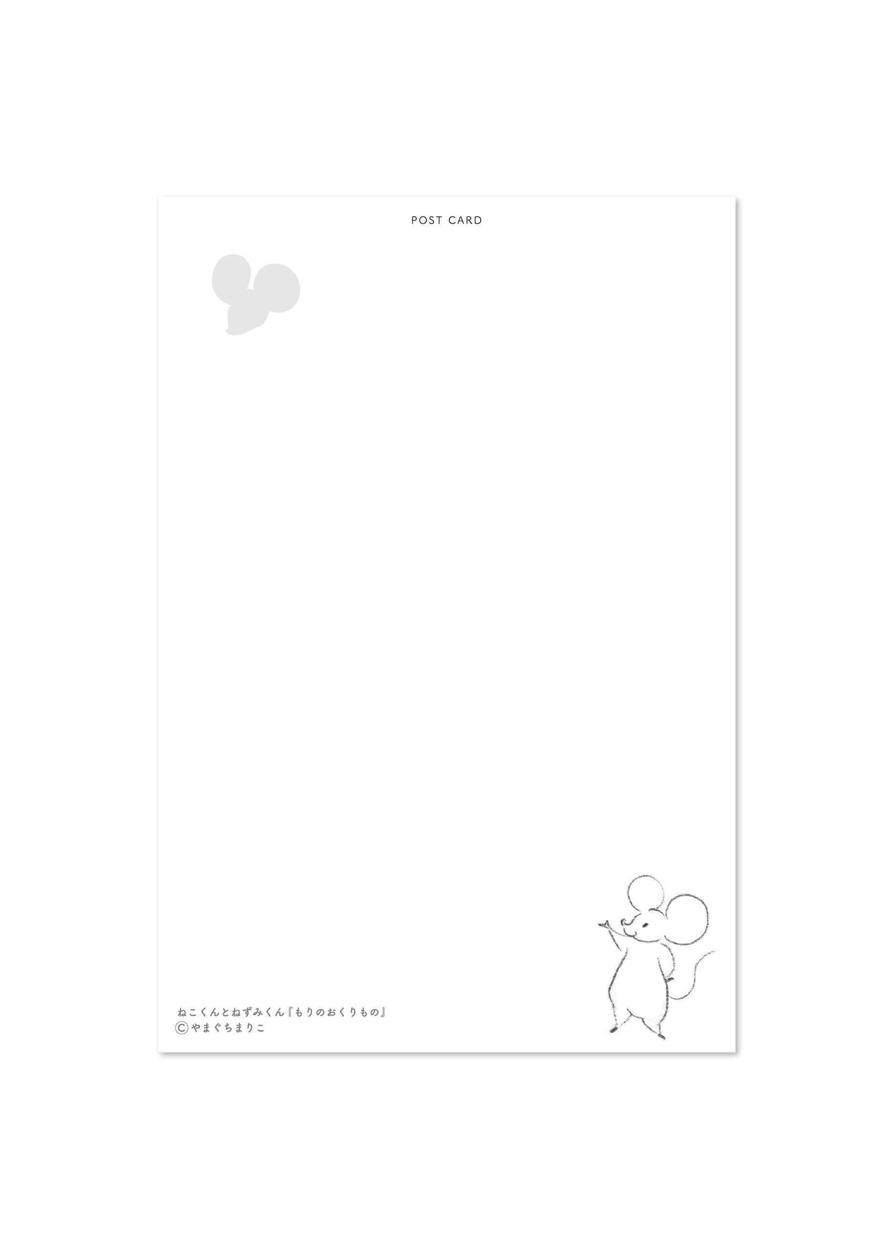 やまぐちまりこ絵本「ねこくんとねずみくん 森のおくりもの」のお話の場面をきりとったポストカードです。